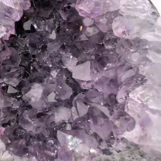 This natural amethyst geode features sparkling purple crystals formed inside a beautiful open crystal cavity. Each surface catches the light, creating a stunning decorative piece that highlights the natural beauty of the crystal formation.